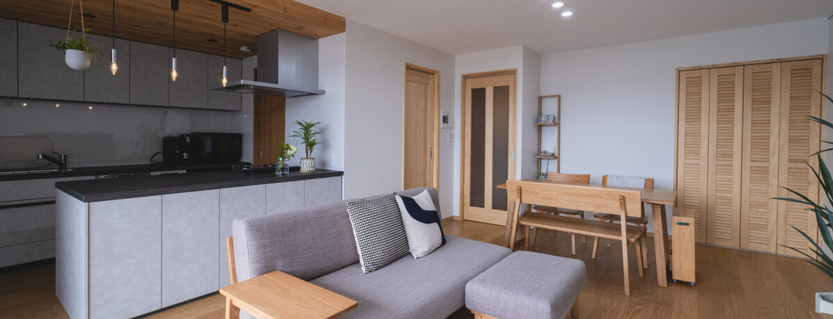 築39年のRCマンションをフルリノベーション。 光と風が巡る温かな木質感と、優しいアール壁が特徴です。 家事や収納もスッキリこなせる計画で、お日様が似合う「こころ晴れる」住まいが完成しました。