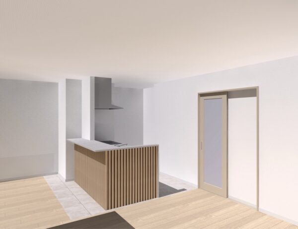 キッチン前の洋室は、間仕切りを取っ払い一つながりの空間にしました。