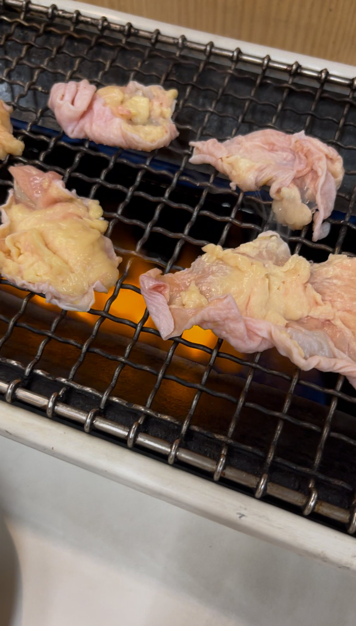 鶏肉の部位を注文して、自分の席のコンロで自分で焼いていくスタイル。