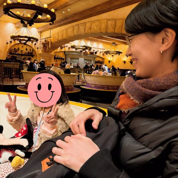一番楽しみにしていた『美女と野獣』のアトラクションに乗れて大満足のダブルピース!