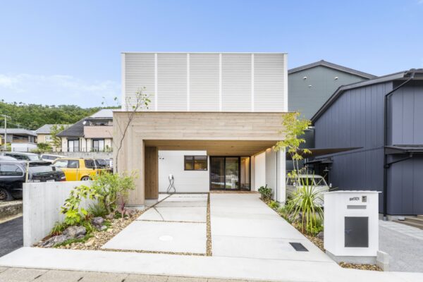 敷地間口は約7.6m、京都の郊外らしい、開放的な敷地に計画した2階建て住宅です。